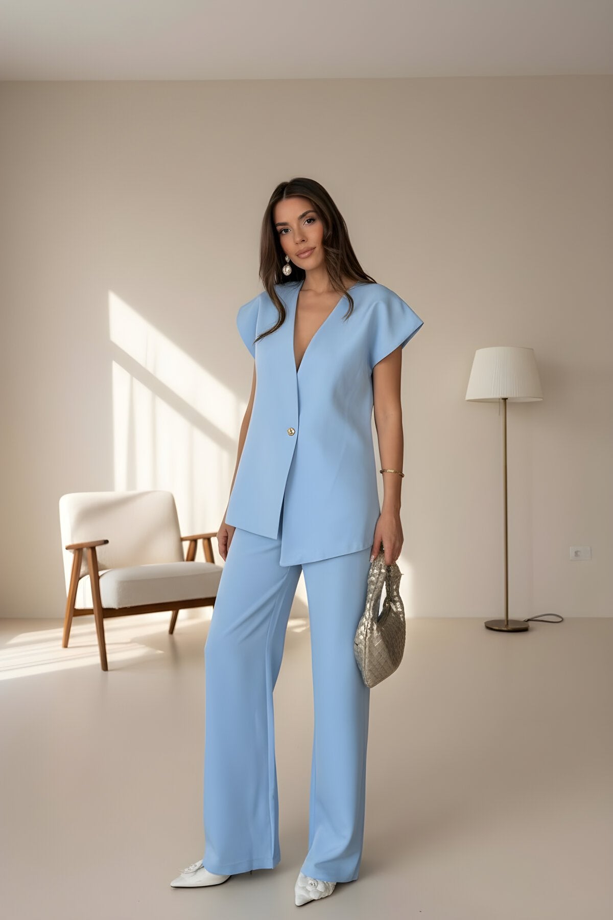 - Vest-trousers set with half placket button closure detail, offering a stylish and modern look.; - While creating a simple and elegant style with its unprinted design, its double-pocket structure provides practical use.; - This set, which can be easily preferred thanks to being lined, increases your comfort in daily wear.; - This set, which can be easily opened and closed with its buttoned design, ensures you maintain your elegance in every environment.; - These trousers, which draw a trendy silhouette with their wide-leg cut, offer freedom of movement while having a comfortable fit with their oversize fit.; - When maintained in accordance with the washing instructions, it maintains its first-day quality for a long time; it can be preferred in all seasons.; - It ensures you feel comfortable all day long thanks to its breathable texture with 99% cotton content.; - This set, which carries feminine lines with its V-neck detail, is presented to the taste of women with a young and dynamic style.; - While the high waist design completes the modern cut, the sleeveless top piece gives a feeling of coolness in the summer months.; - It allows you to look stylish even in trend environments; ideal for daily use.; - The woven fabric type increases durability and helps the product maintain its shape.; - Specifically designed for women / girl users; compatible with every size with regular length options.