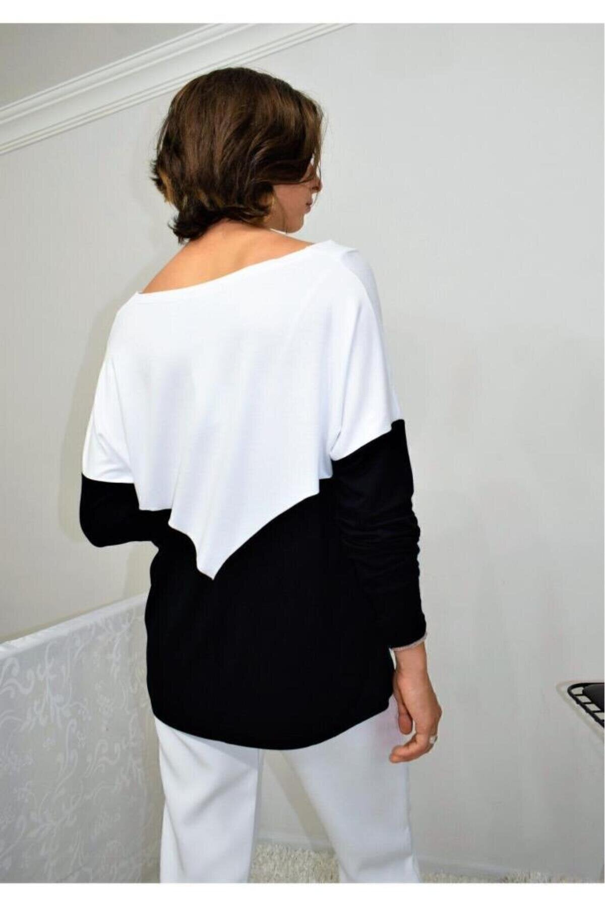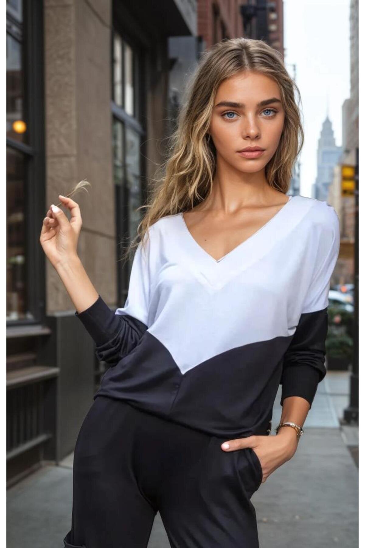 V-Neck Color Block Soft Textured Combed Cotton Blouse - Black White