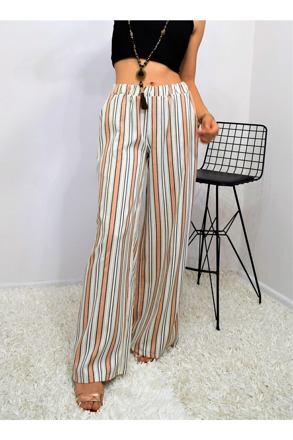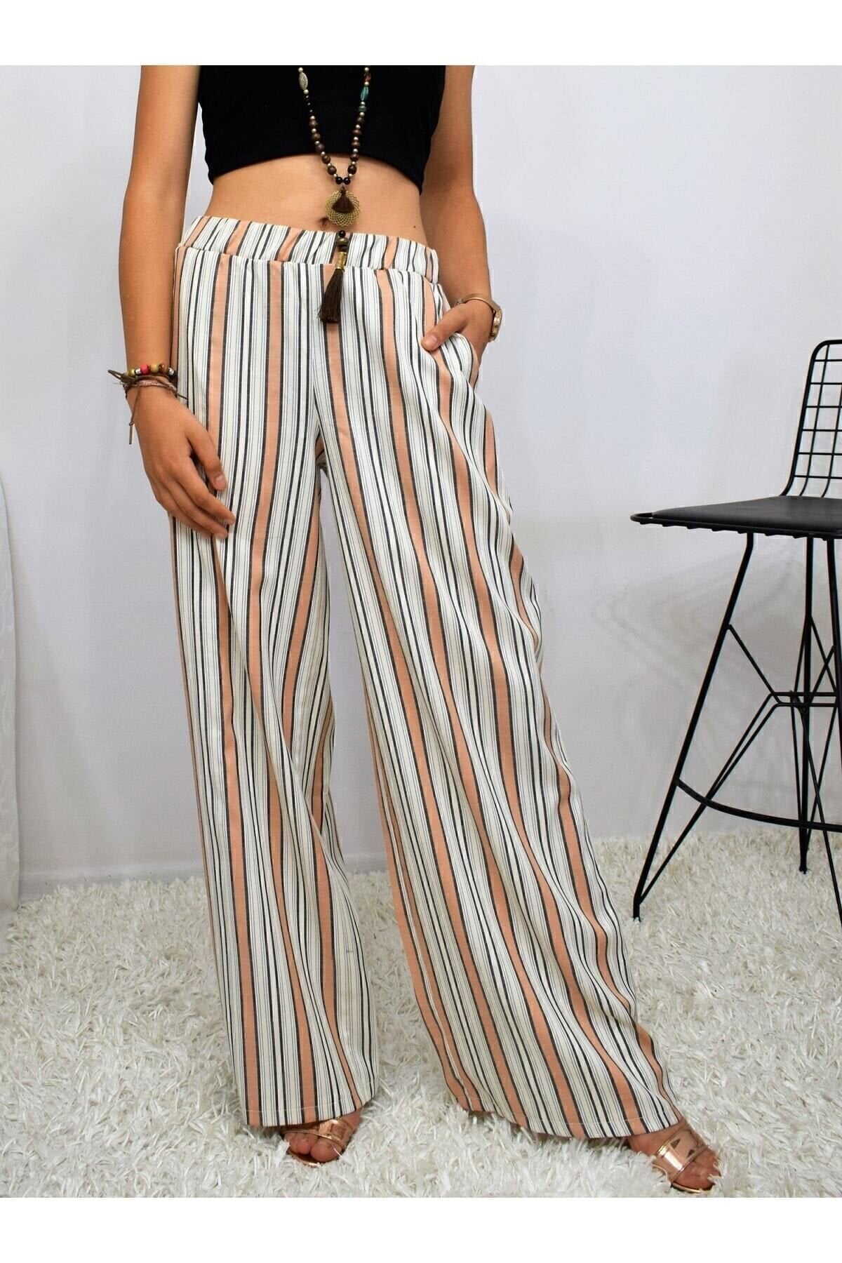 Vertical Striped Elastic Waist Pocketed Pants - Terracotta Beige