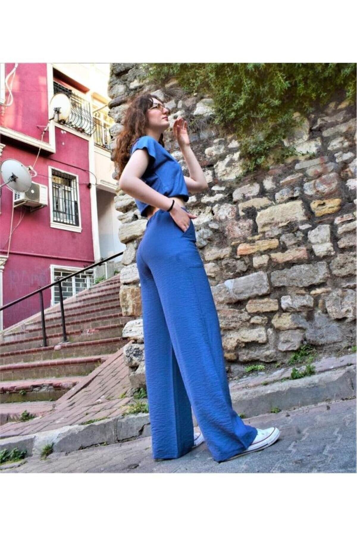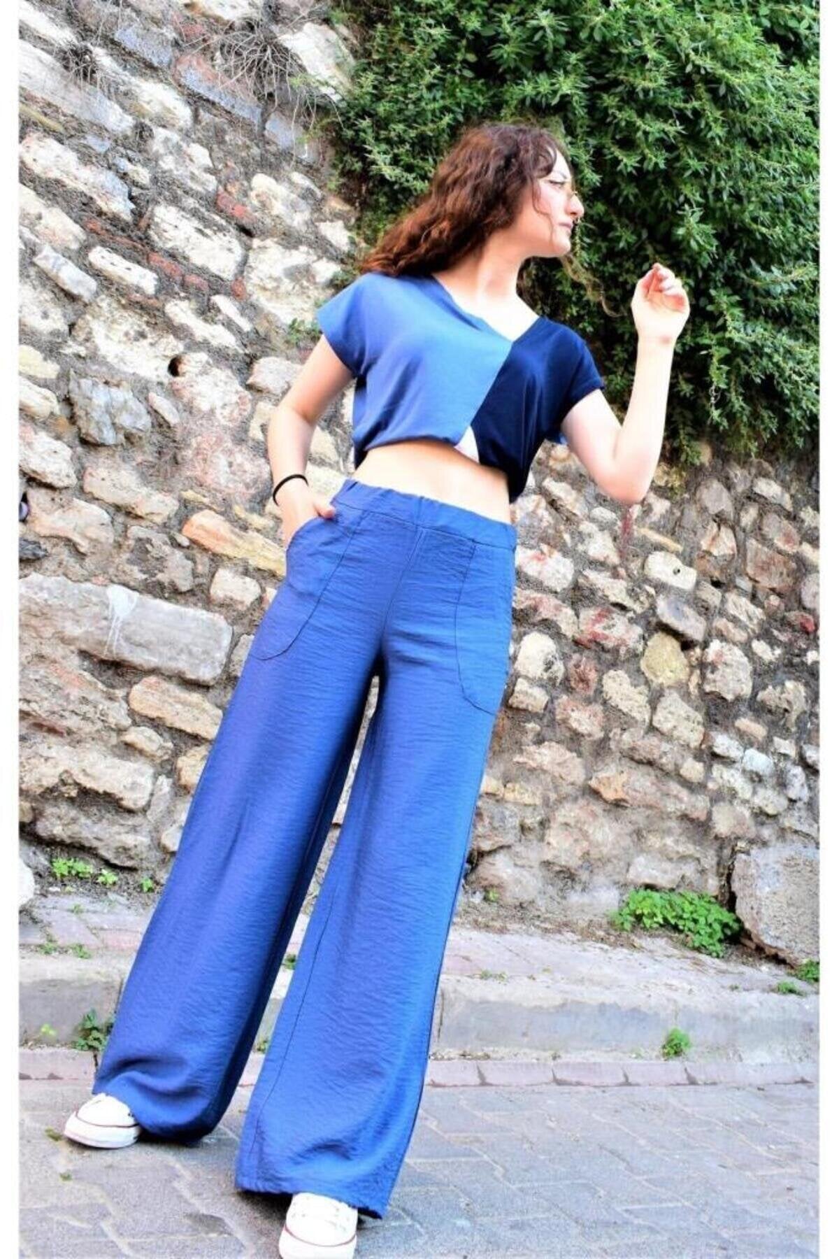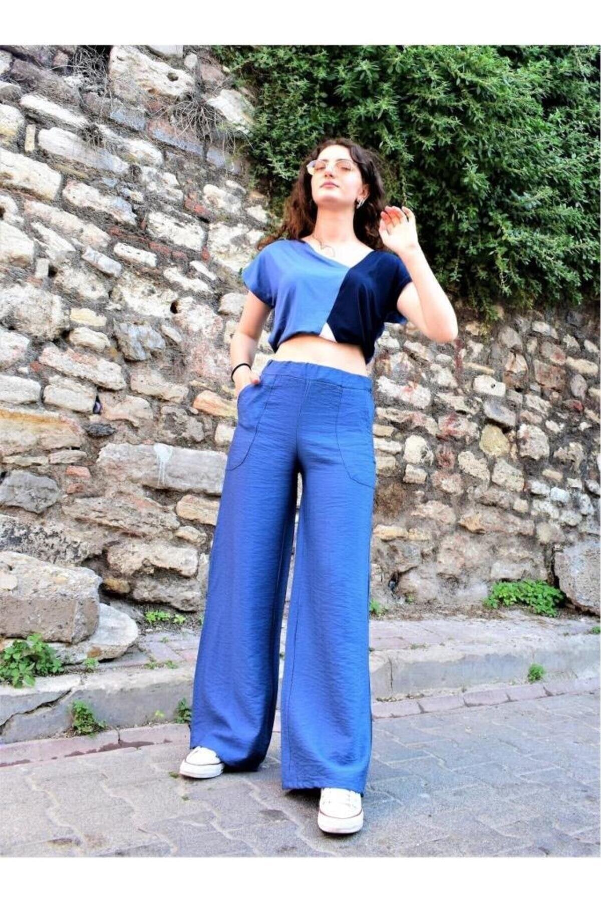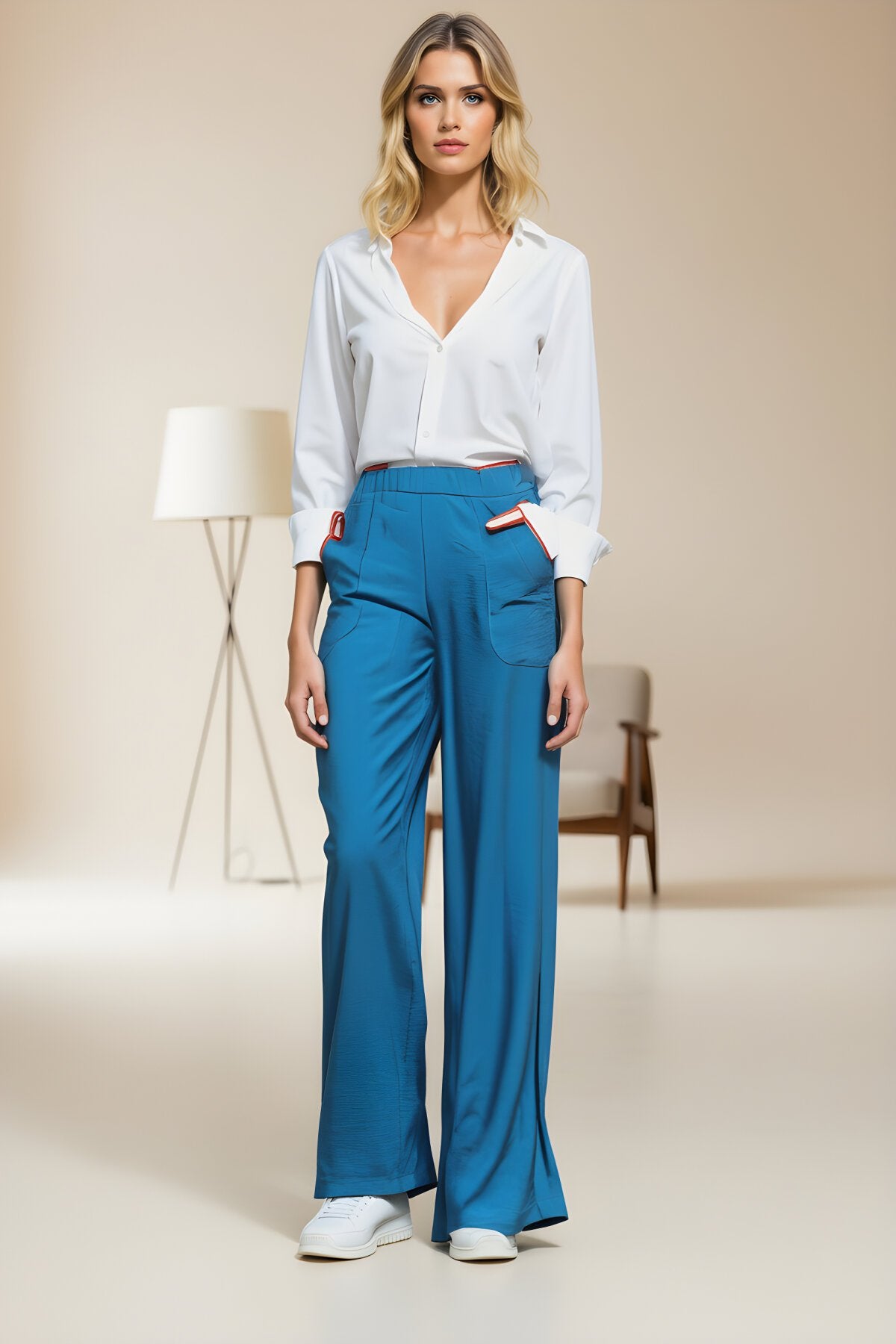 Wide-Leg Linen-Textured Elastic-Waist Two-Pocket Pants - Blue