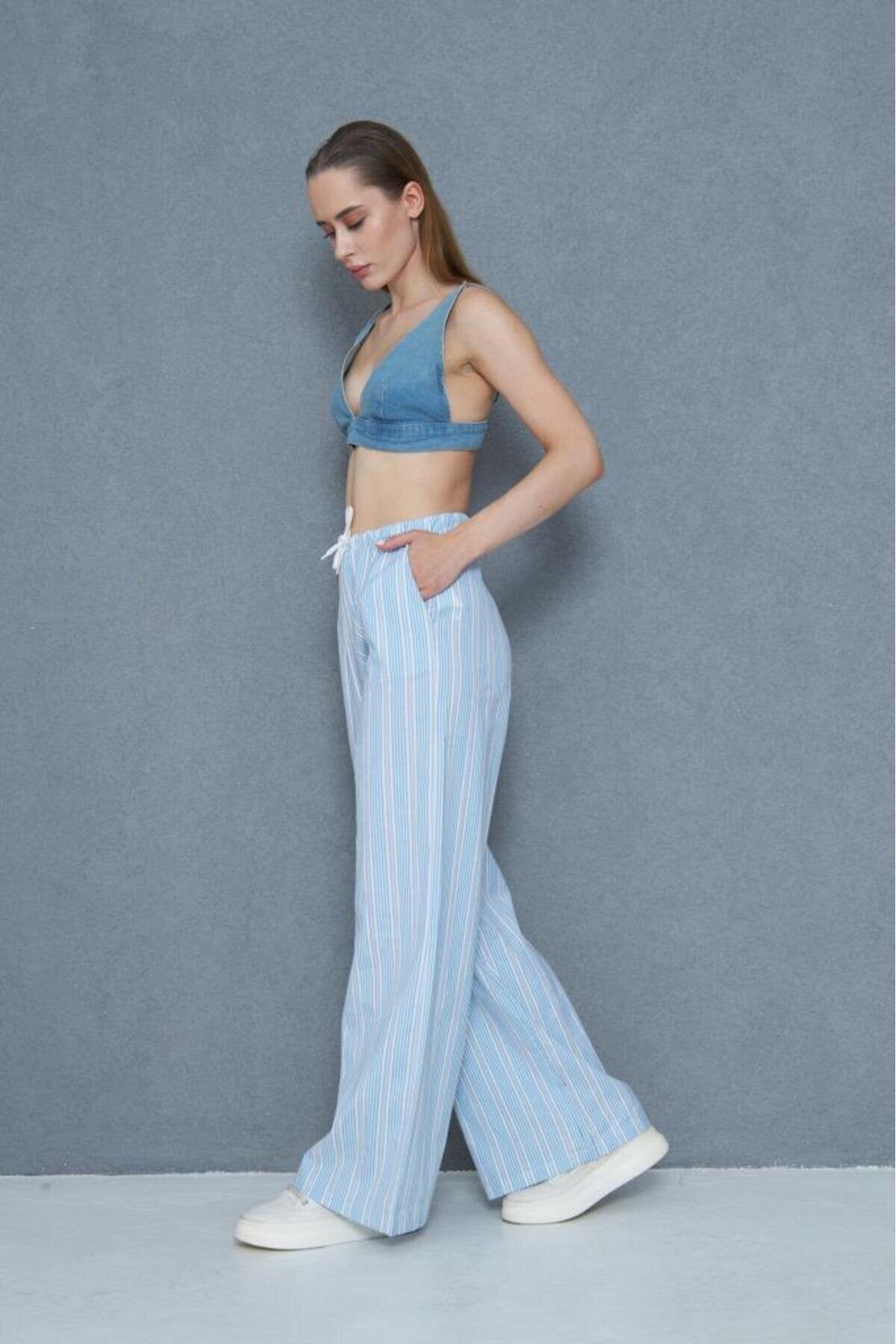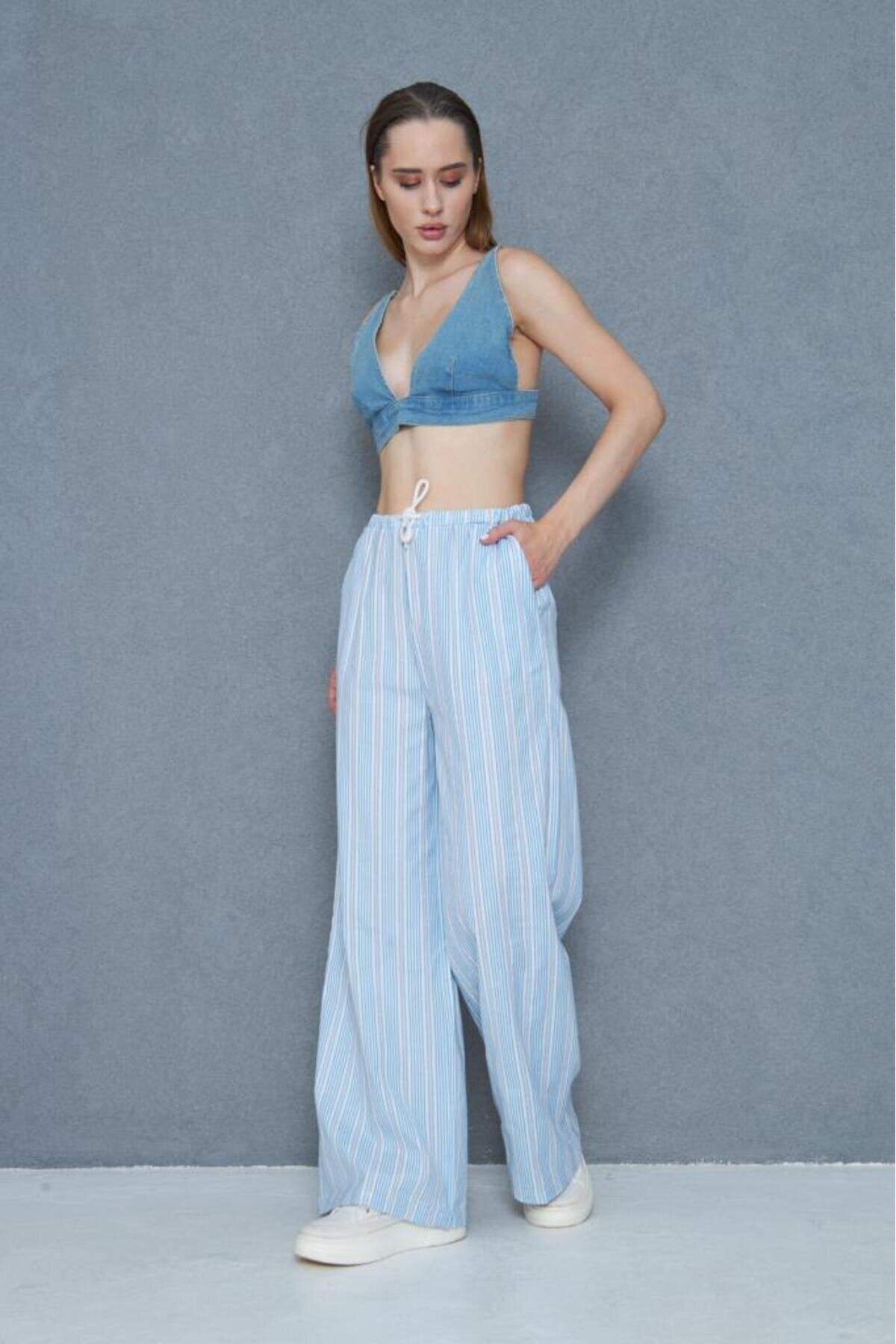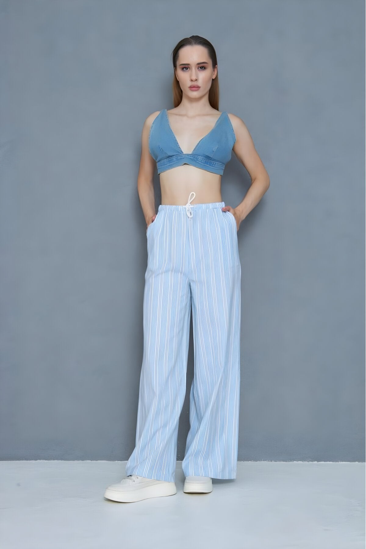 Wide Leg Poplin Drawstring Waist Pocket Eyelet Detail Pants - Blue