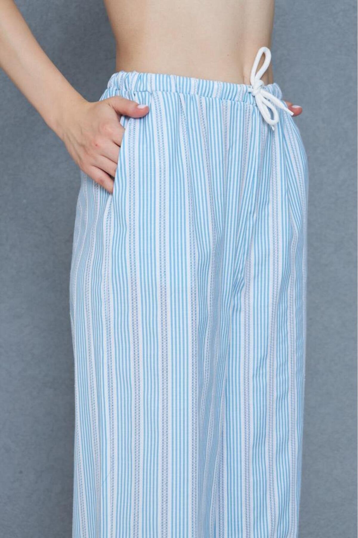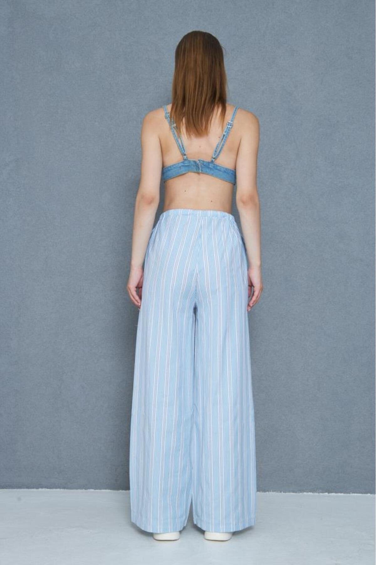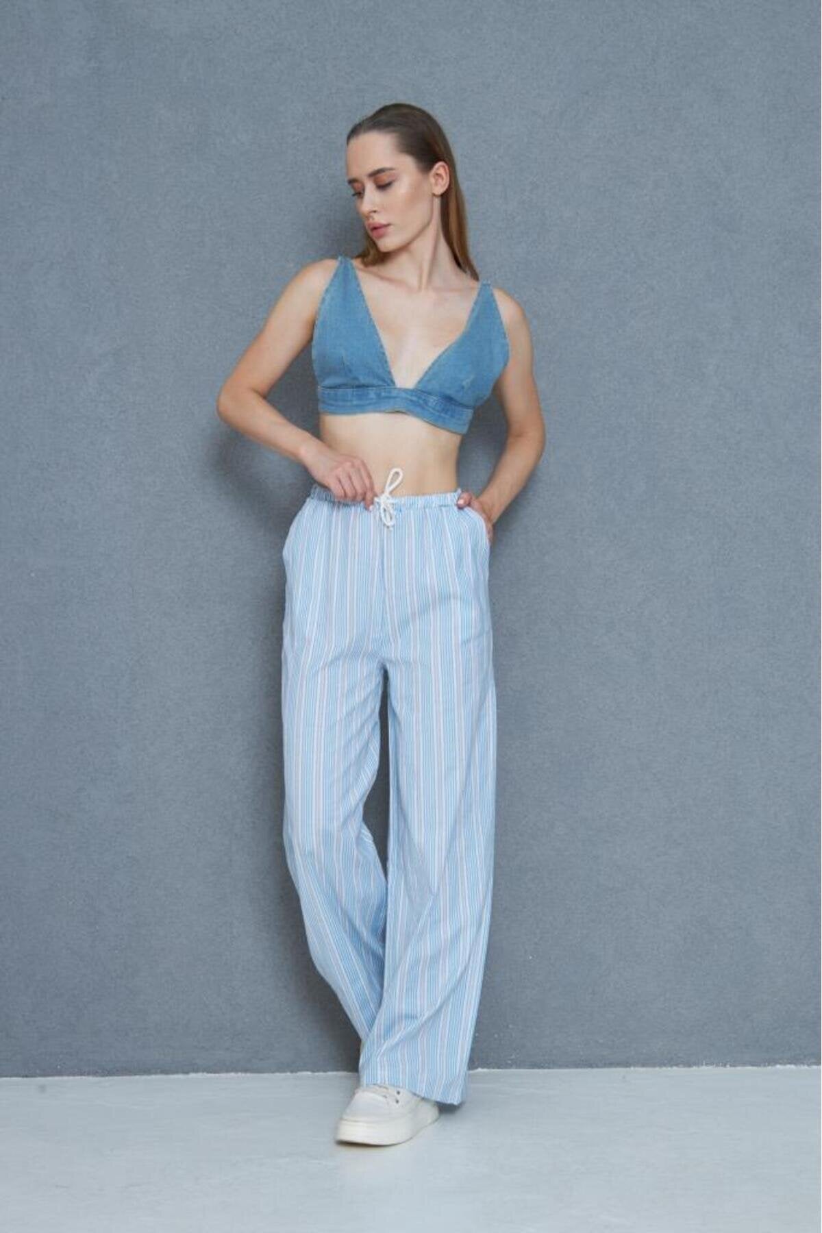 Wide Leg Poplin Drawstring Waist Pocket Eyelet Detail Pants - Blue
