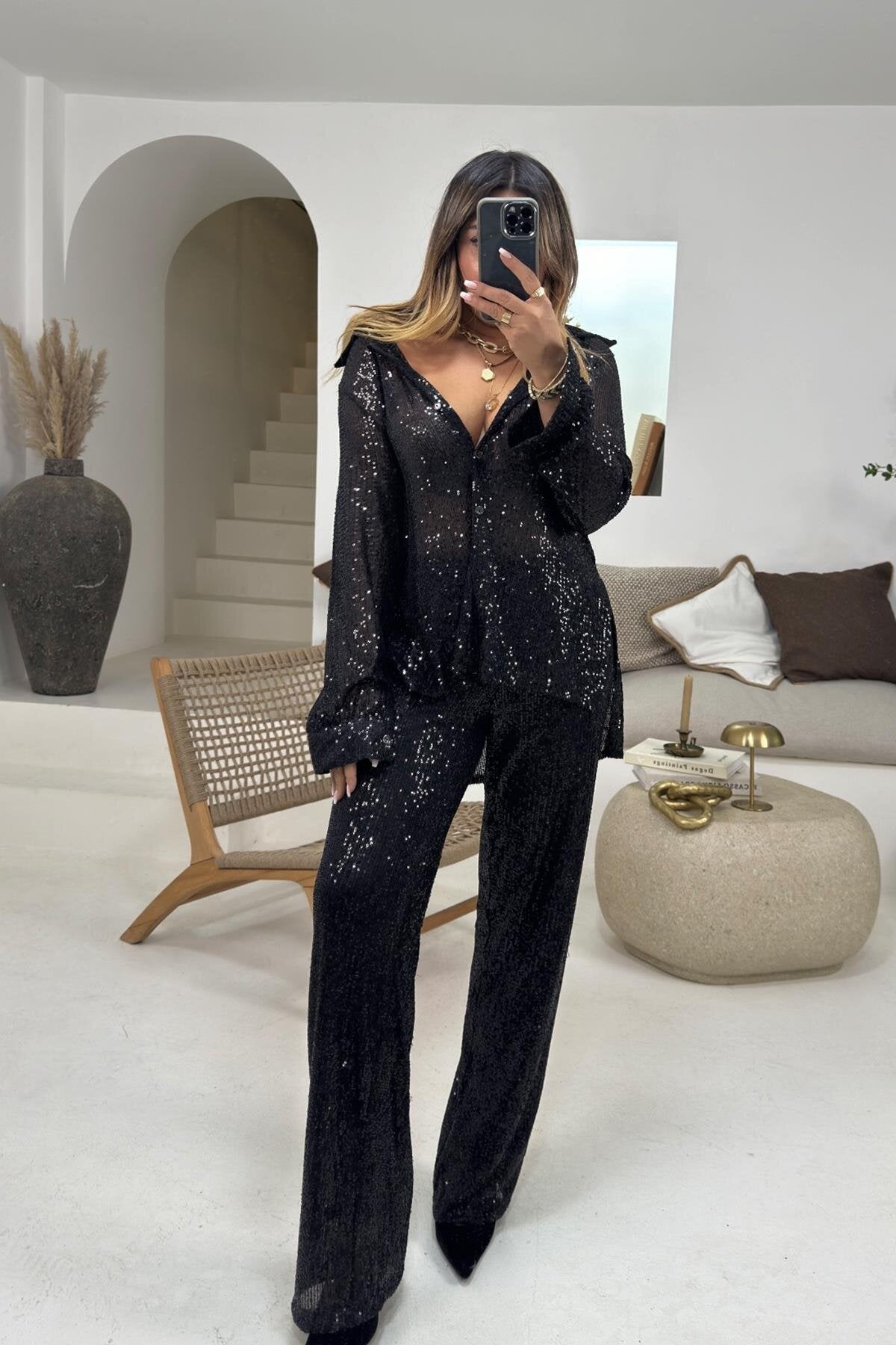 Wide Leg Sequined Pants - Black