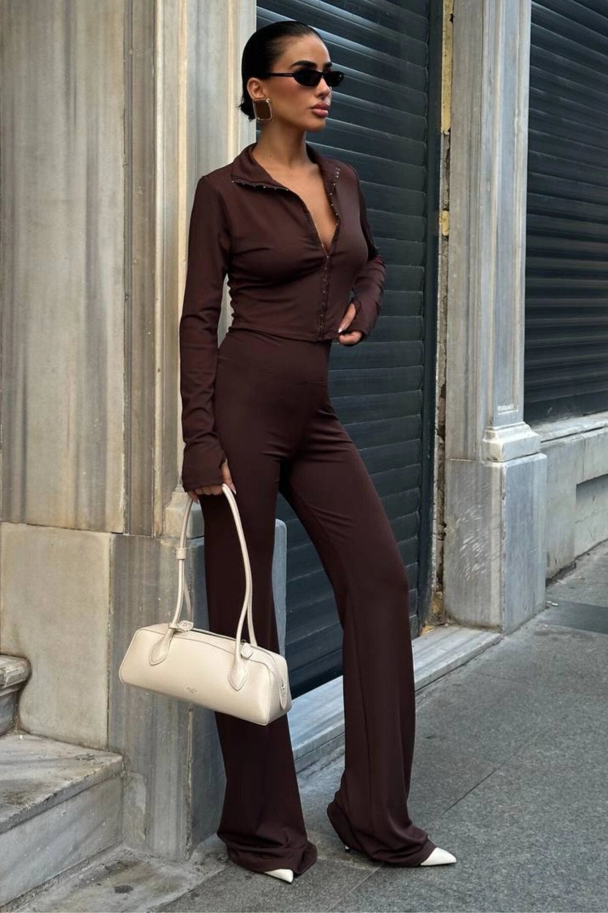 Wide Leg Stretchy Hook-and-Eye Set - Brown